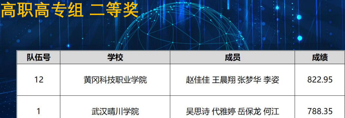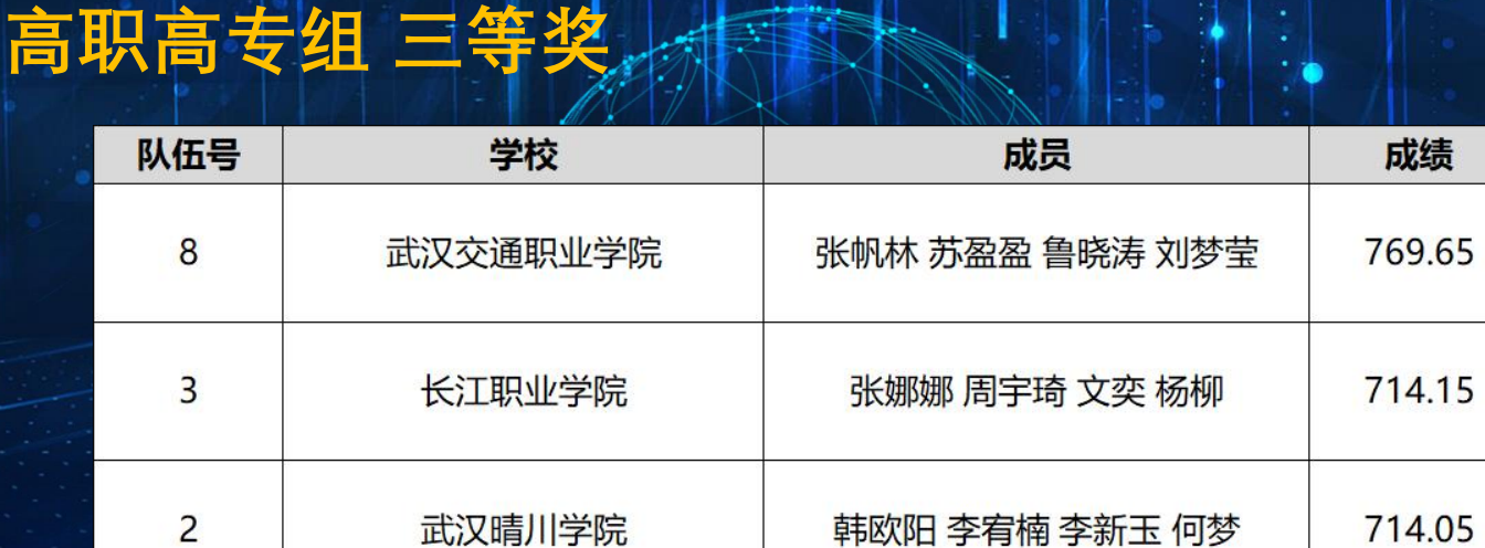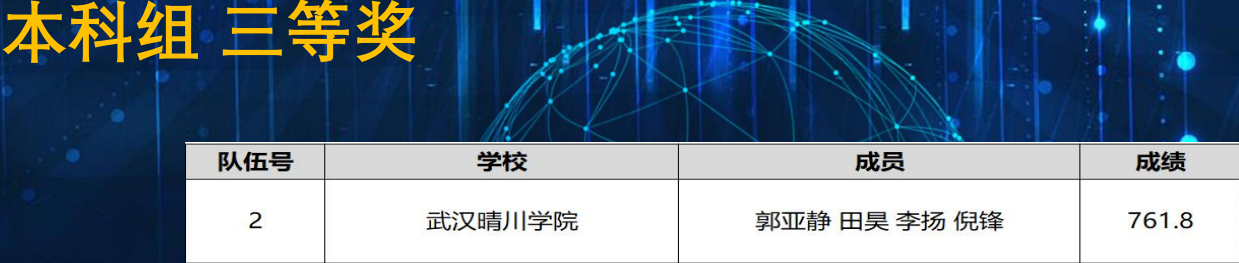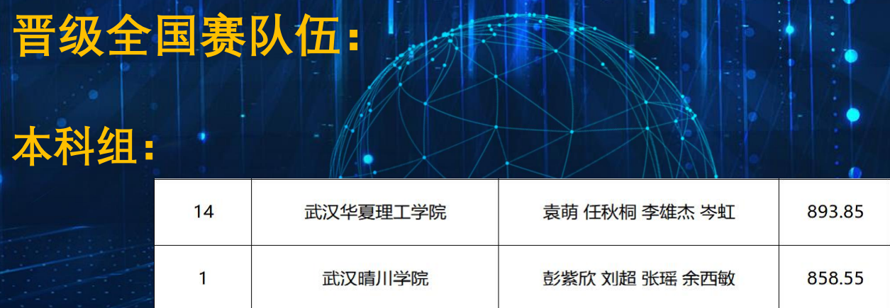 彭紫欣、刘超、张瑶和余西敏四位同学组成的队伍以858.55的高分,斩获湖北本科组一等奖,成功晋级全国赛。郭亚静、田昊、李扬、倪锋组成的队伍以761.8的成绩获本科组三等奖。吴思诗、代雅婷、岳保龙、何江组成的队伍以788.35的成绩获高职高专组二等奖。韩欧阳 李宥楠、李新玉、何梦组成的队伍以714.05的成绩获高职高专组三等奖。