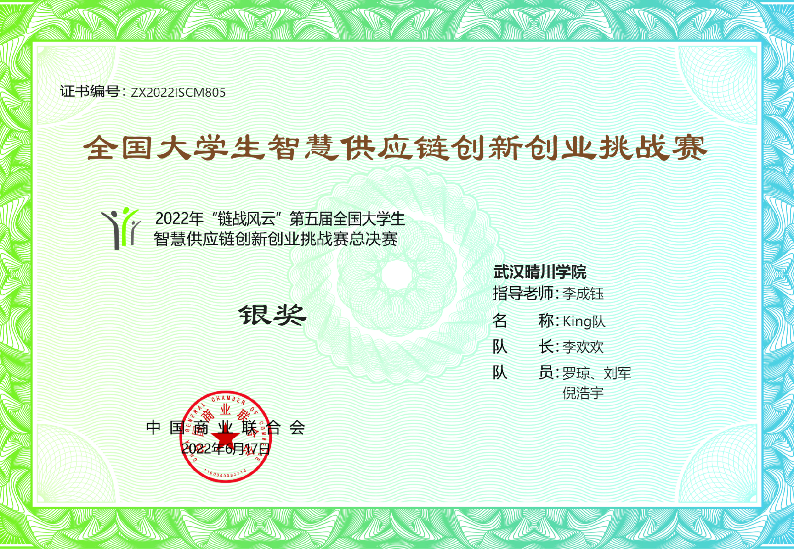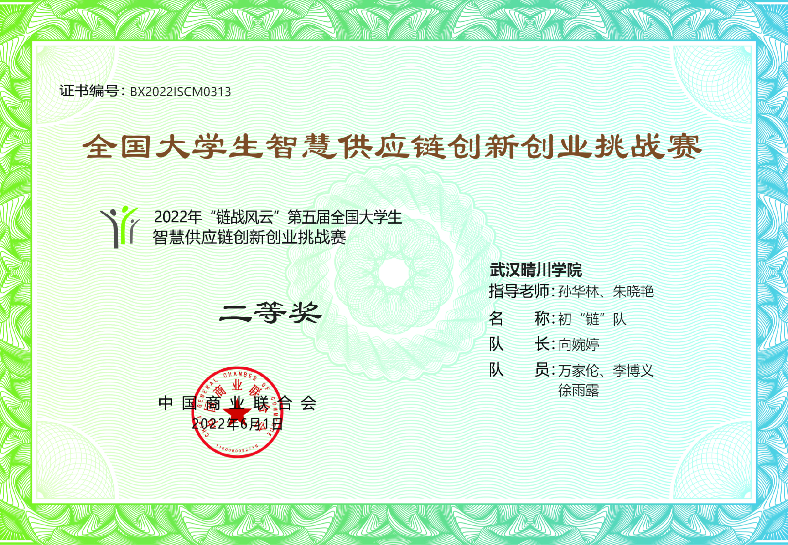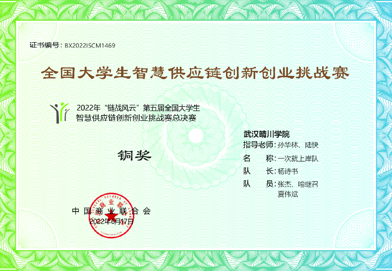 6月9日-12日,2022年“链战风云”第五届全国大学生智慧供应链创新创业挑战赛总决赛于线上举行。此次大赛吸引了30个省市、自治区、直辖市,496所院校,包括武汉理工大学、武汉科技大学、武汉轻工大学等在内的874支队伍报名参赛。经过激烈角逐,我校太阳集团官网8722物流管理专业本科组两支队伍、金融科技专业高职组两支队伍均在本次比赛中均荣获国家级奖项。