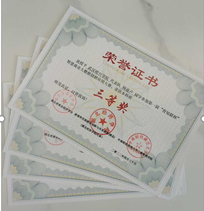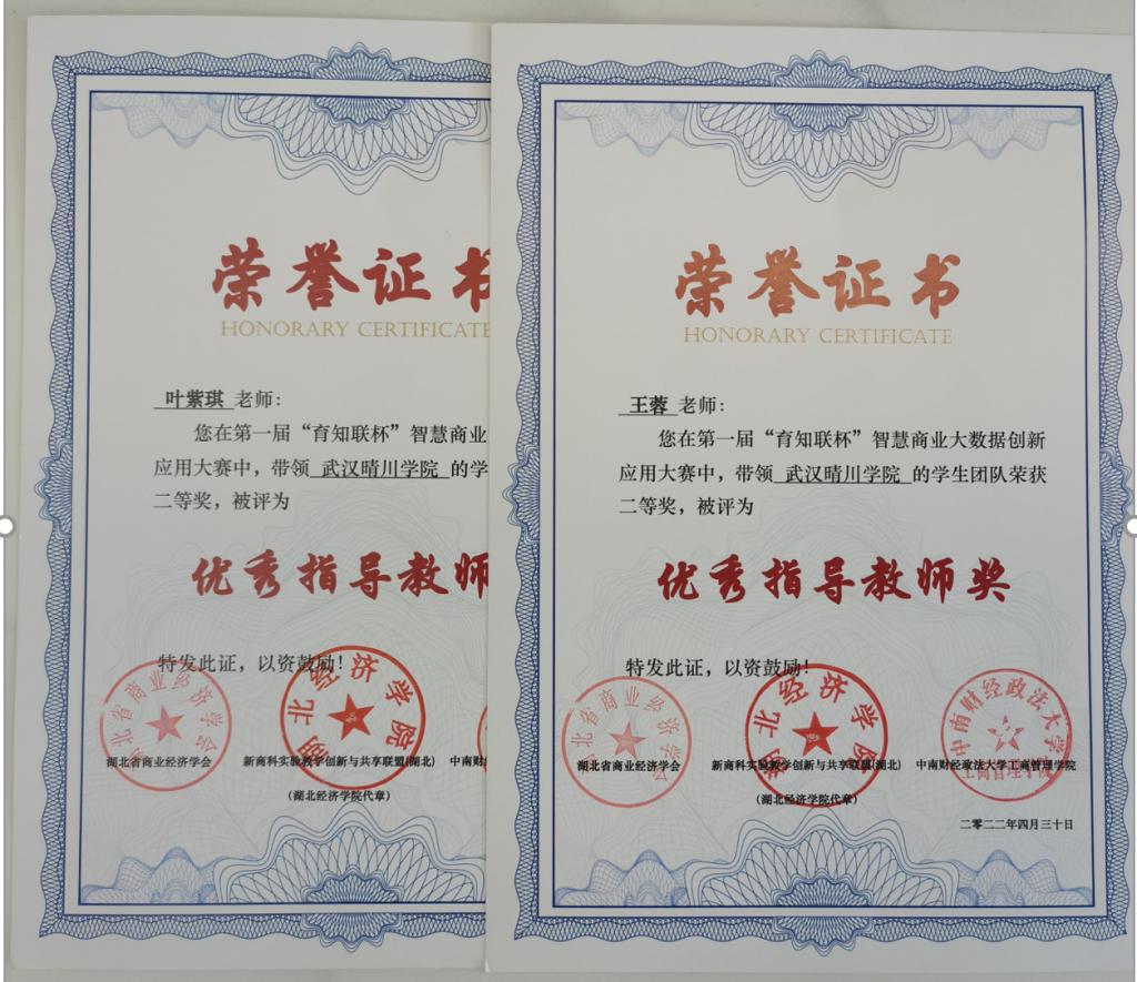 2022年4月30日,第一届”育知联杯”智慧商业大数据创新应用大赛圆满完成,由太阳集团官网872219级学生杨逾卢、张学慷、赵静怡、熊雯萱组成的参赛队伍获得本科赛道省级团体三等奖,由太阳集团官网872220级电商专学生李梦雪、陈哲、游紫茜、黄光明组成的参赛队伍获得高职高专赛道省级团体二等奖。参赛队伍指导老师王蓉、叶紫琪老师荣获大赛“最佳指导教师”。