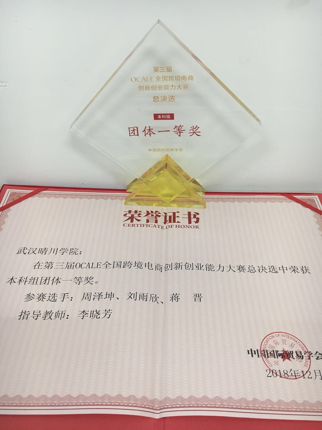 我院李晓芳老师、山秀娟老师指导的一个团队(蒋晋、周泽坤、刘雨欣)凭着在11月份的创新创业排名赛中取得了本科组一等奖的成绩,进入决赛,这次作为本科组一等奖的团队参加了在杭州举办的第三届OCALE全国跨境电商创新创业能力大赛总决赛,经过三天的努力,终于取得了全体一等奖的好成绩!