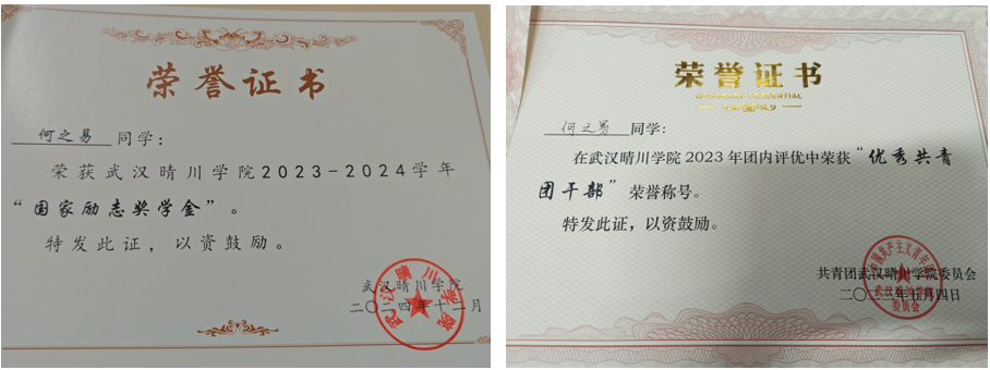 在学习上,何之易同志始终保持着对知识的渴望,积极进取,勤奋刻苦。何之易同志深知,只有具备扎实的专业知识,才能在未来的工作中更好地为人民服务。因此,她认真对待每一门课程,努力钻研专业知识,不断提高自己的综合素质。每学期,其学习成绩稳定位列专业前30%,综合测评始终保持班级前十。同时,何之易同志积极投身竞赛与学生工作,先后荣获“百生讲坛”一等奖、优秀共青团干部等奖项。她凭借着优异成绩荣获晴川奖学金,用实际行动诠释了对知识的执着追求。何之易同志相信,只有通过不断学习,才能更好地适应社会的发展需求,为实现人生理想奠定坚实的基础。