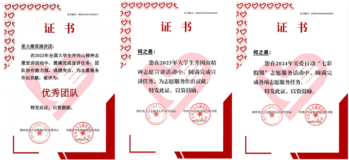 何之易同志不仅在学习和工作中表现突出,同时积极投身社会实践,以实际行动践行志愿精神。她积极参与井冈山精神志愿宣讲活动,通过宣讲的方式为大家介绍井冈山精神的内涵。作为一名预备党员,何之易同志深刻认识到传承红色基因的重要意义,以及弘扬井冈山精神的责任。