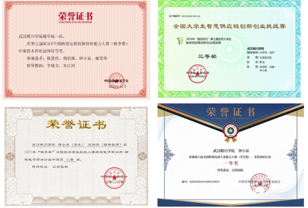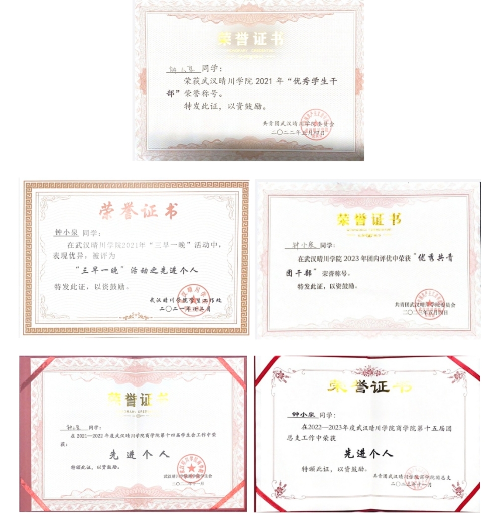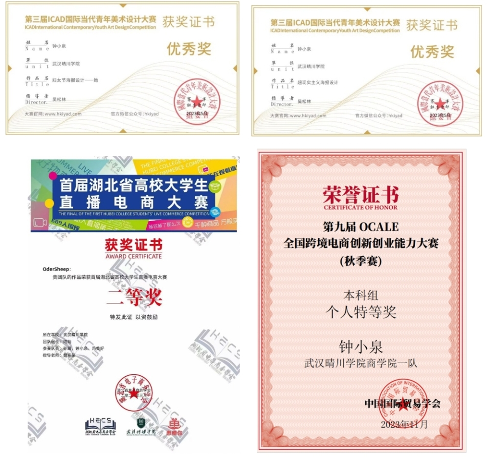 钟小泉同志在学业上表现优异,连续三年位于专业前列:大一时获得专业第一,大二大三稳居专业第二;综合素质测评成绩大一大三期间双获专业第一,展现出扎实的专业功底。她注重理论与实践结合,积极投身学科竞赛,在跨境电商、电商直播、供应链管理等领域屡获佳绩。在校期间,她多次斩获国家级奖项、省级奖项,并凭借着优异成绩荣获国家励志奖学金、晴川奖学金,用实际行动诠释了对知识的执着追求。