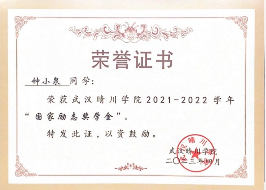 (注释:荣获国家励志奖学金)