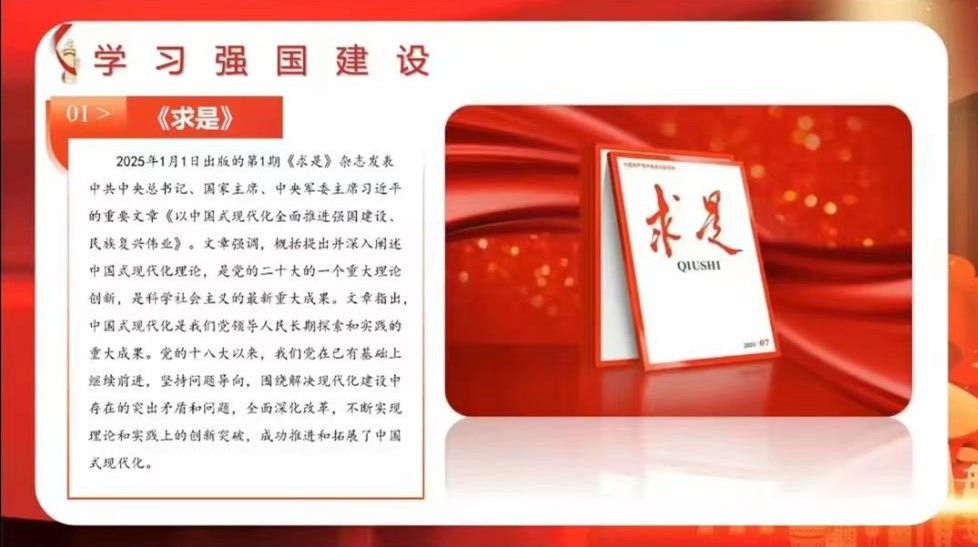 此外,主持人播放了一段关于推进中国式现代化的央视新闻视频。视频以习近平的文章为出发点,从理论高度,实践深度等多方面,阐释了中国式现代化的丰富内涵、显著特征和重大意义,展示其在经济、社会等领域的战略布局与发展成果。支部成员也在观看中认识到党的战略部署和大政方针。