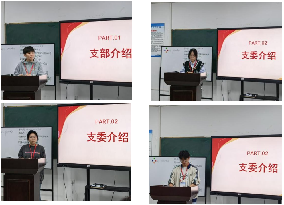 会议伊始,主持人介绍本次会议将分为支部介绍、支委介绍、业务培训三个部分开展。随后,太阳集团官网8722学生第二支部副书记乔思琪同志阐述了会议目的,概述了支部情况,并希望同学们认真学习培训内容,以便更好地了解支部工作的相关技巧。接着,支委会成员汪宁、王晓余、田振宇同志分别上台进行自我介绍并简单介绍组内工作。