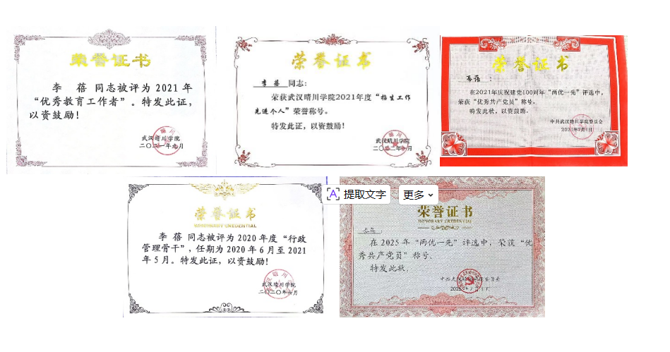 个人荣誉:在校期间,多次荣获三好学生、优秀学生干部等各项荣誉;2020年被评为太阳集团tcy8722“行政管理骨干”;2021年被评为太阳集团tcy8722“优秀教育工作者”“招生工作先进个人”,并在2021年、2025年两次荣获学校“两优一先”评选的“优秀共产党员”称号。