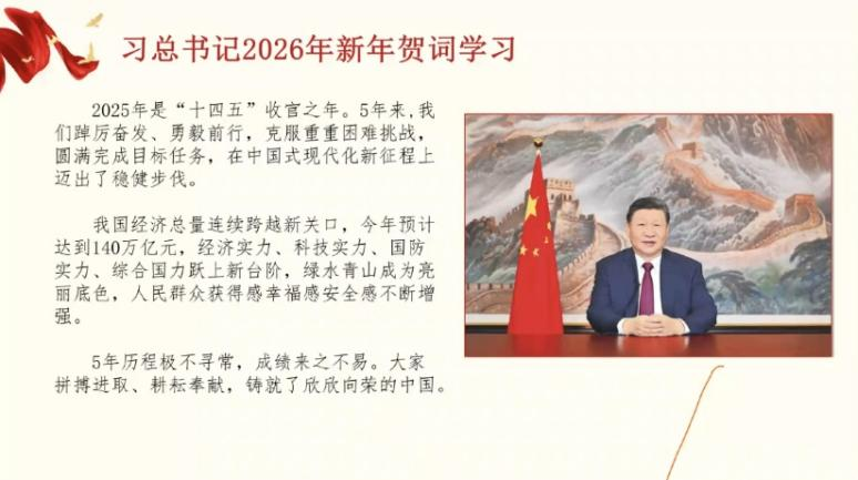 在理论学习环节,主持人王希怡带领大家深入学习习近平总书记二〇二六年新年贺词的核心内容。她指出,贺词中“跃马扬鞭、实干担当”的号召,是“十五五”开局之年的奋进号角,为青年一代在新征程上指明了行动方向。成员们深受鼓舞,纷纷表示将把贺词精神内化于心、外化于行,以奋发有为的姿态投入学习和实践。