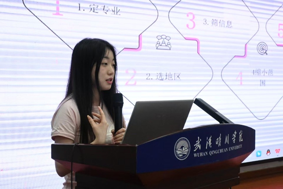 接下来为大家分享相关考研经验的是孙诗鹿学姐。她围绕“定专业、选地区、筛信息、缩小范围、利用身边资源”五个方面,将考研相关要点向大家一一道来。她鼓励大家广泛搜集相关院校信息,积极向考研成功的学长学姐请教,不断学习相关经验。随后,她还向大家分享了自己的备考经验。对于那些本专业难度不大的同学,她建议在社交平台上选择适合自己的老师,通过自学的方式来进行备考。在心态方面,她则表示同学们要学会调整心态,规划好学习计划,把握好自己的节奏。