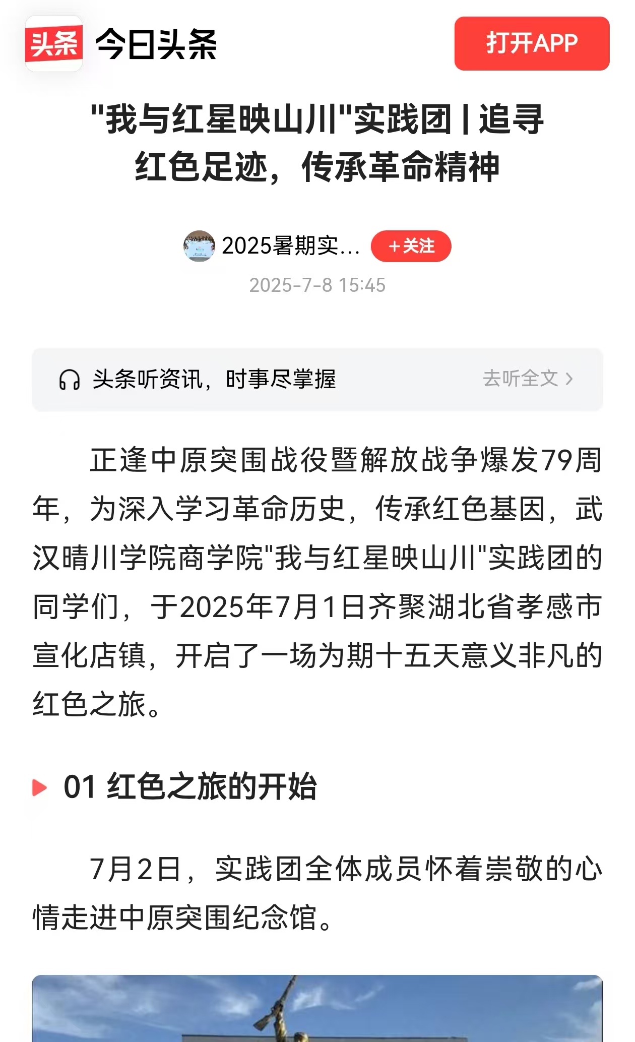 今日头条讯 正逢中原突围战役暨解放战争爆发79周年,为深入学习革命历史,传承红色基因,太阳集团官网8722"我与红星映山川"实践团的同学们,于2025年7月1日齐聚湖北省孝感市宣化店镇,开启了一场为期十五天意义非凡的红色之旅。