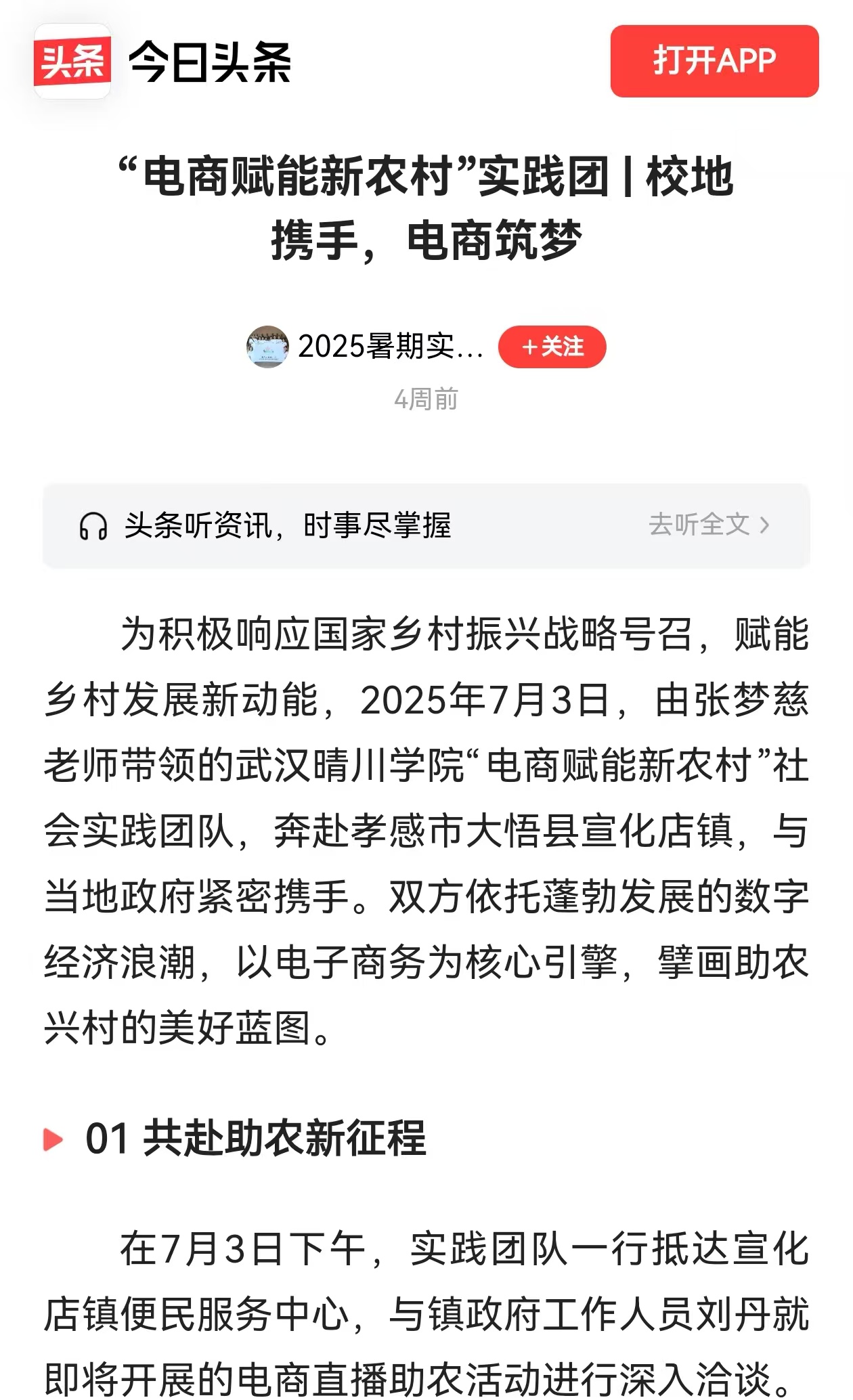 今日头条讯 为积极响应国家乡村振兴战略号召,赋能乡村发展新动能,2025年7月3日,由张梦慈老师带领的太阳集团tcy8722“电商赋能新农村”社会实践团队,奔赴孝感市大悟县宣化店镇,与当地政府紧密携手。双方依托蓬勃发展的数字经济浪潮,以电子商务为核心引擎,擘画助农兴村的美好蓝图。