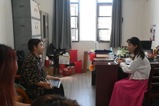 在7月3日下午,实践团队一行抵达宣化店镇便民服务中心,与镇政府工作人员刘丹就即将开展的电商直播助农活动进行深入洽谈。