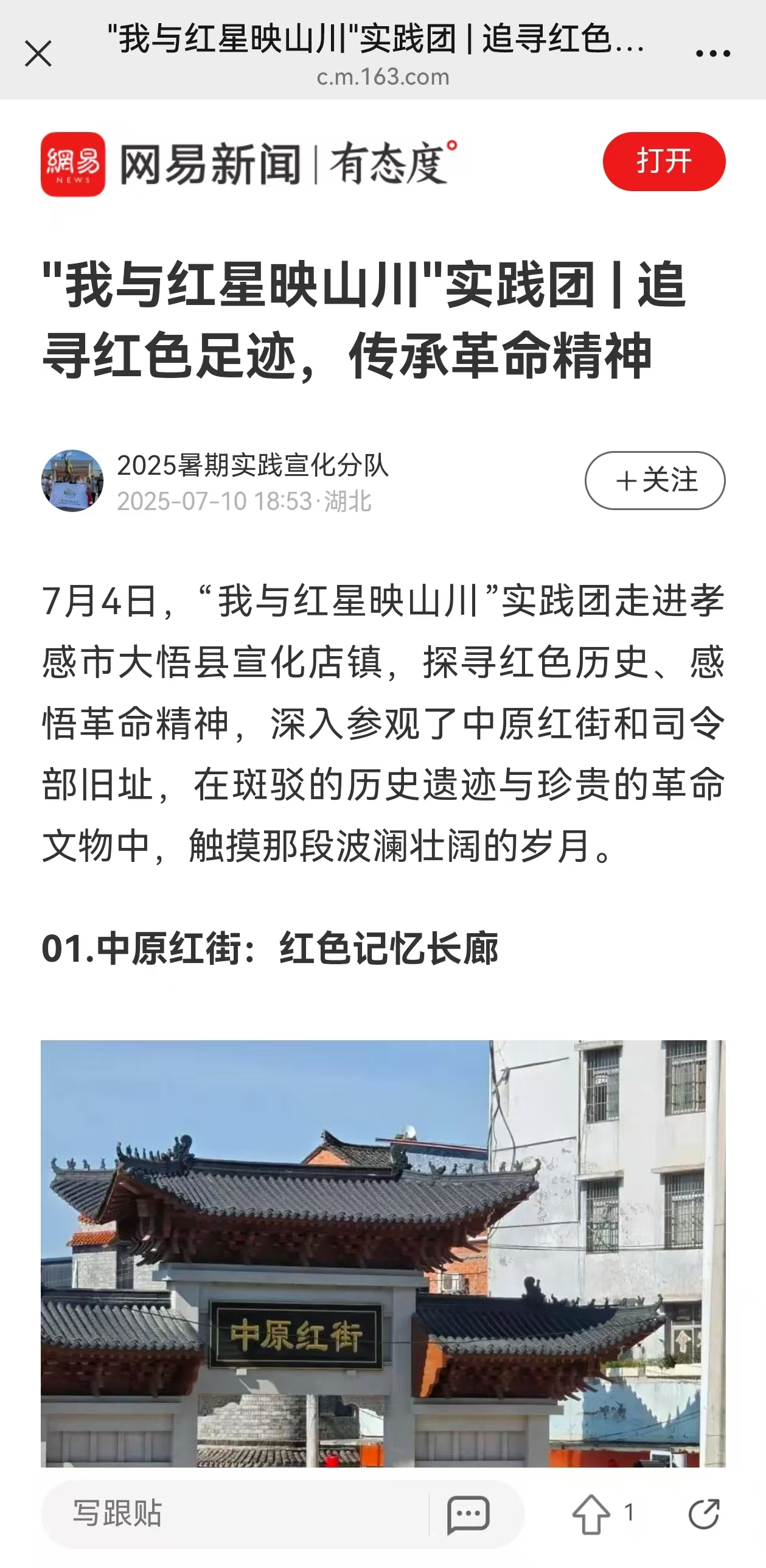 网易新闻 7月4日,“我与红星映山川”实践团走进孝感市大悟县宣化店镇,探寻红色历史、感悟革命精神,深入参观了中原红街和司令部旧址,在斑驳的历史遗迹与珍贵的革命文物中,触摸那段波澜壮阔的岁月。
