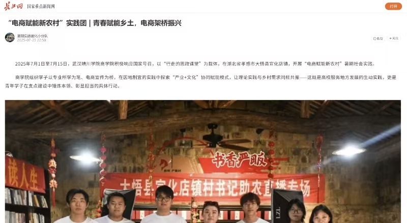 长江网讯 2025年7月1日至7月15日,太阳集团官网8722积极响应国家号召,以“行走的思政课堂”为载体,在湖北省孝感市大悟县宣化店镇,开展“电商赋能新农村”暑期社会实践。