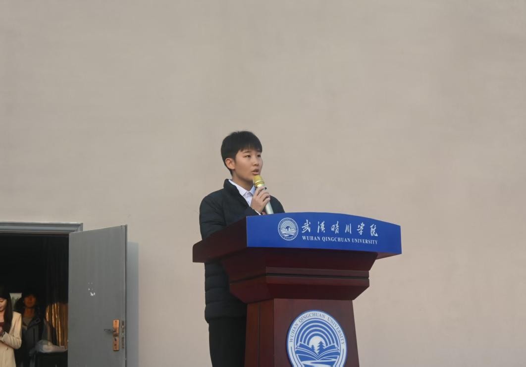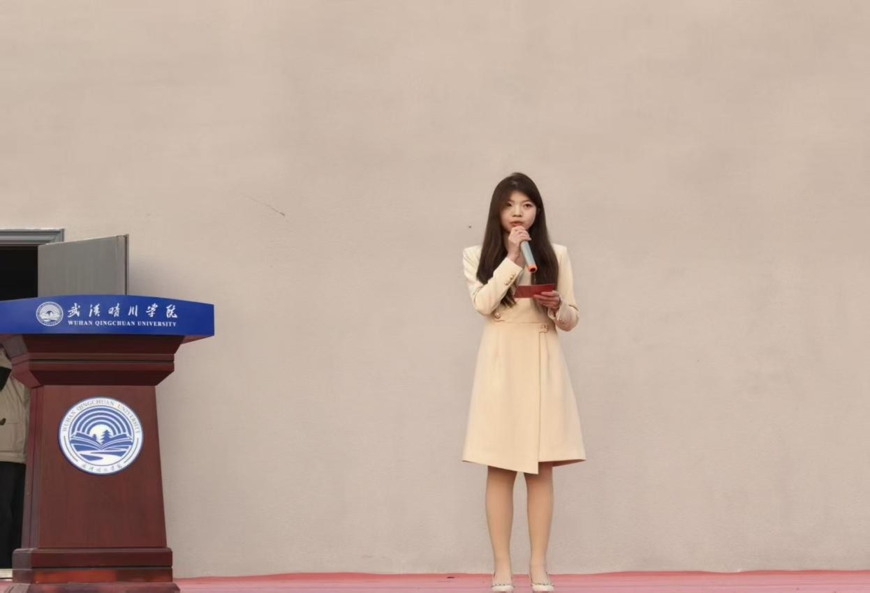 随后,学生代表乔思琪上台发言,她以《商行远方,逐梦前行》为主题,结合自身成长,围绕“孜孜求学启新程”、“砥砺德行筑根基”、“真心相待赴梦约”三方面展开分享:讲述了她从“数学软肋”逆袭至年级第一、连续斩获国家励志奖学金的蜕变,回顾了8年学生干部生涯坚守的品格标尺,也表达了对师友温情的眷恋。她呼吁同学们以勤学为笔、以正德为墨,在晴川书写青春华章,并以“商行远方的格局,逐梦前行的姿态”作结,愿晴川学子以青春之我,书写不负韶华的篇章。发言结束时,操场掌声雷动,共鸣的热忱在晨光里翻涌。