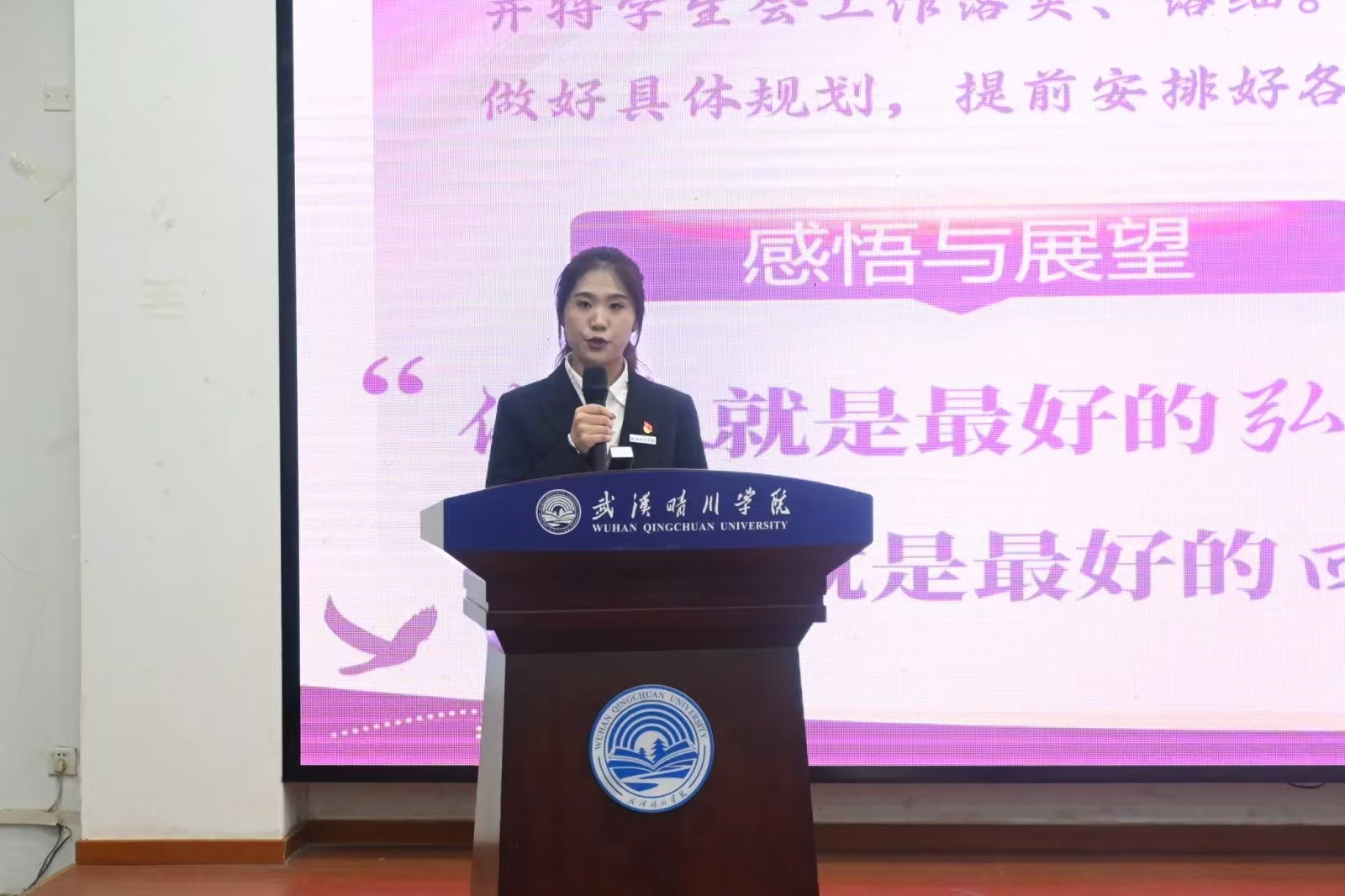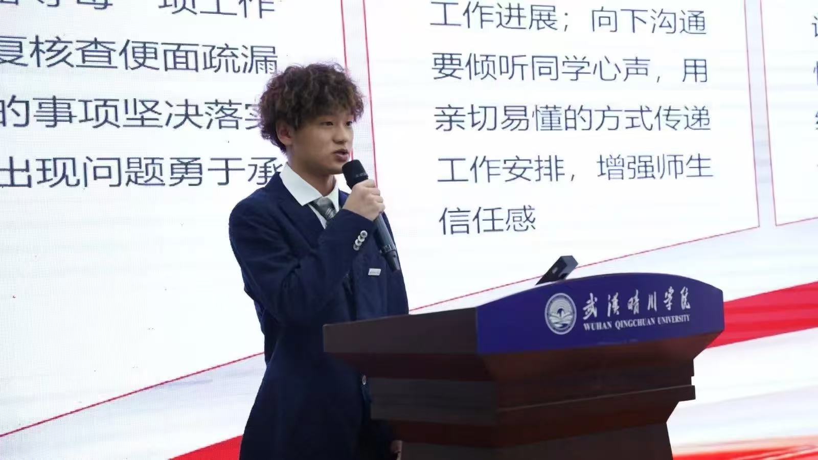 学生会副主席龚泉羽紧接着作提案报告。报告基于前期广泛调研,系统梳理了同学们在课程设置、生活服务、校园设施完善等学习生活各方面的诉求与合理化建议,详细阐述了提案的收集过程、核心内容及初步回应方案。这份满载学子心声的报告,充分展现了学生会“以同学为中心”的服务理念,以及搭建师生沟通桥梁的责任担当。