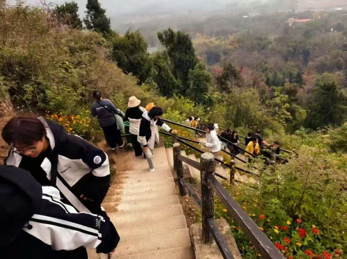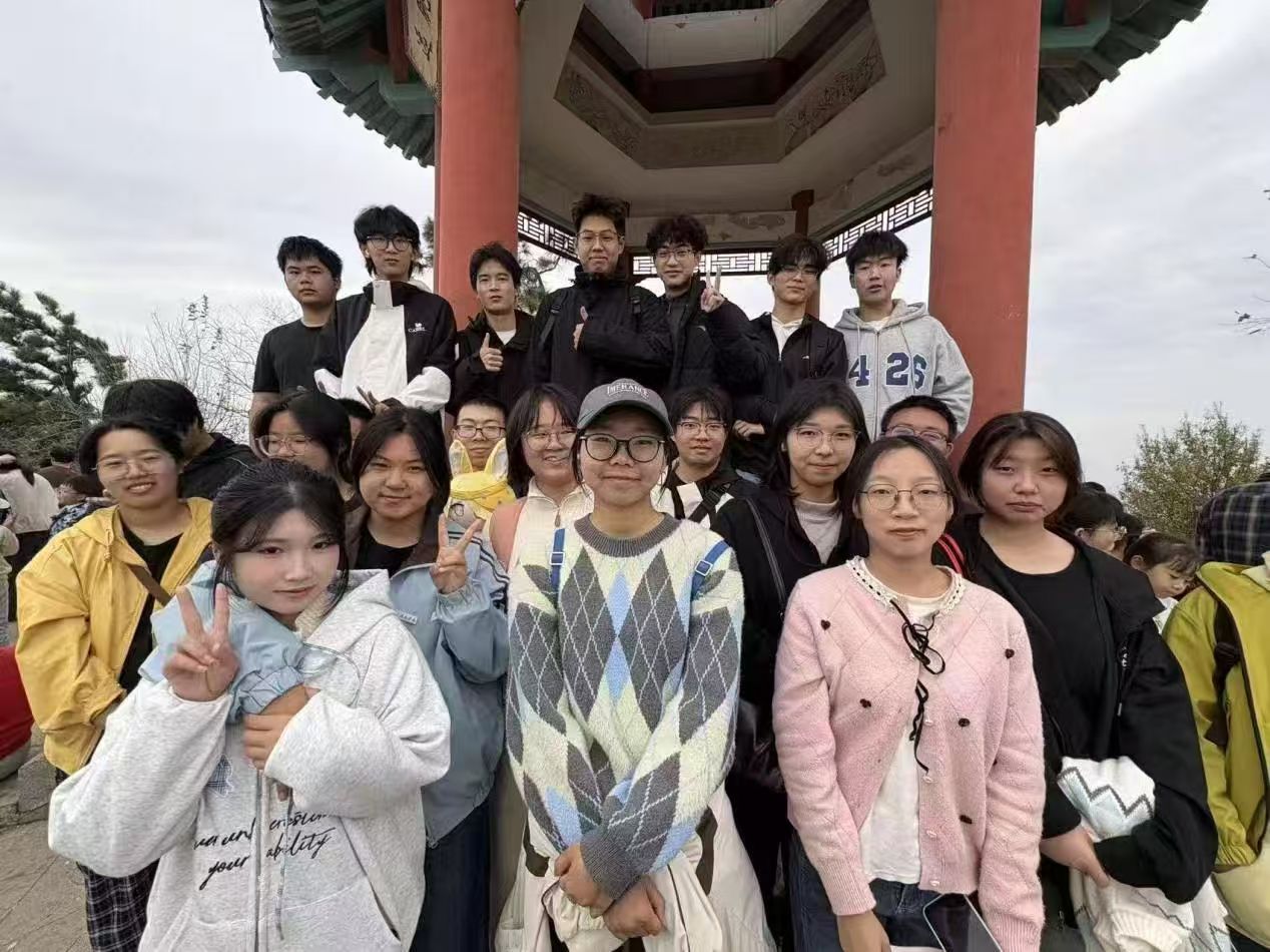 清晨集结登山后,同学们三五结伴,途中互帮互助——分担背包、提醒路况,生疏感在协作中消解;山腰拍照环节笑声不断,定格青春模样的同时,班级向心力初步显现。更可贵的是,大家自发收纳随身垃圾,以“无痕山林”行动,践行物流管理专业“绿色责任”理念,让担当见于细微。山顶合影时,秋景与笑脸相映,定格“众行远”的集体共识。