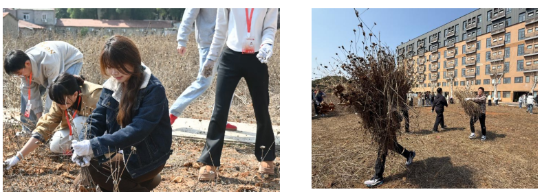活动正式开始后,大家迅速投入到清理枯草的工作中。大家戴好手套,成群地分散在种植区域,仔细地将枯黄的杂草逐一拔除、收拢。大家配合默契,有的弯腰捡拾,有的负责搬运,不一会儿,原本杂乱的地面就变得整洁开阔,为不久的植树环节腾出了充足的空间。