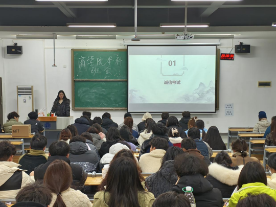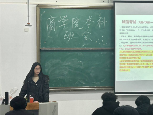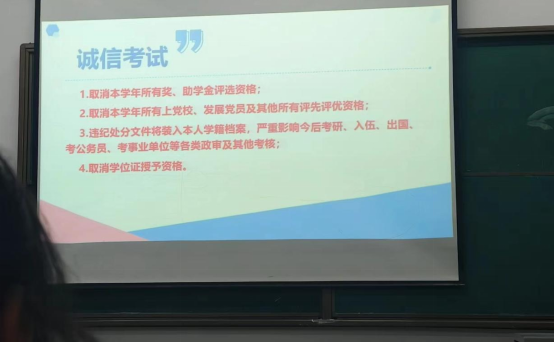 太阳集团官网87222022级本科生、专升本学生辅导员张梦慈在12月15日的“严肃考风考纪,共建诚信校园”班会上重点强调了诚信考试的重要性,结合学校新的学籍管理办法、学位授予办法、考试违规违纪条例等文件给学生一一进行了详细说明。