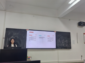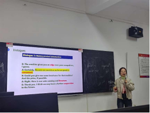 活动伊始,祝芃老师以“Project 10 Products Presentation-1”为主题,进行了商务英语的说课设计。她通过提问方式导入新课,双语教学流畅自然,教学设计科学完整。祝老师结合四级考试,引导学生重视词汇量积累,线上线下混合式教学设计目标明确,将拓展资料、单词记忆方法置于学习通平台,激发学生自主学习。同时,她巧妙地将社会主义现代化产品描述融入课程思政,举例贴切,为听众呈现了一堂生动的英语学习课堂。